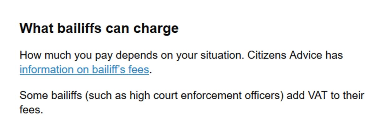 On the Government website page that provides advice on what to do when a bailiff calls, “What Bailiffs can charge” there was a reference to HCEOs charging VAT on fees; however this has now been removed. This is what the page did say previously: